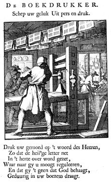 Description: Two printers are working at the printing press; finished printed sheets are hanging on suspended drying racks. In the right background, in front of the open windows, a typesetter is setting type in front of a box with type fonts. The Dutch artist and poet Jan Luiken (1649-1712) was responsible for drawing this emblem and for creating the motto and poem that follow. Jan Luiken and/or his son Casper Luiken (1672-1708) were responsible for its etching. The attendant scripture text is Psalm 90:15-17.