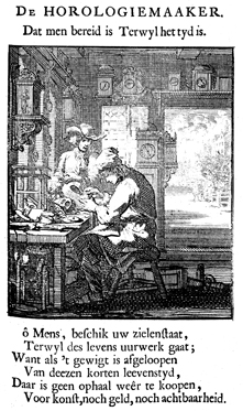 Description: The watchmaker, sitting at his worktable, examines a pocket watch, while a potential client watches. A number of grandfather clocks hang on the walls around him. Through the open door, a city square with trees is visible. The Dutch artist and poet Jan Luiken (1649-1712) was responsible for drawing this emblem and for creating the motto and poem that follow. Jan Luiken and/or his son Casper Luiken (1672-1708) were responsible for its etching. The attendant scripture text is Psalm 144:4 though Luiken misquotes Psalm 143:4.