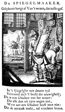 Description: The mirror maker holds a mirror in an elaborate frame; behind him sits his apprentice. Mirror frames with and without glass hang on the wall. A city scene with a canal is visible through the open door. The Dutch artist and poet Jan Luiken (1649-1712) was responsible for drawing this emblem and for creating the motto and poem that follow. Jan Luiken and/or his son Casper Luiken (1672-1708) were responsible for its etching. The attendant scripture text is Romans 1:20.