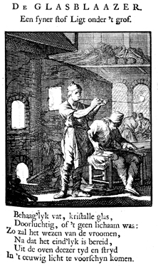 Description: The glass blower, standing with his back to the oven, is in the process of blowing a glass ball. A second worker inspects and cuts off a blown object from the blowpipe; a third worker places wooden logs into the furnace. Bundled supplies of reed are stored on an overhead shelf. The Dutch artist and poet Jan Luiken (1649-1712) was responsible for drawing this emblem and for creating the motto and poem that follow. Jan Luiken and/or his son Casper Luiken (1672-1708) were responsible for its etching. The attendant scripture text is 1 Corinthians 15:53.