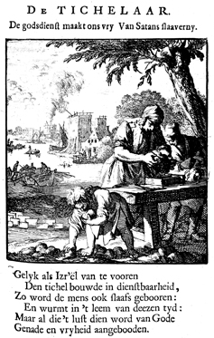 Description: Under a tree, a brick maker forces the kneaded clay into a wooden mold. A helper kneads clay (left) and a barefooted young man picks up lumps of raw clay from the ground (right). The scene is set next to a busy river. The Dutch artist and poet Jan Luiken (1649-1712) was responsible for drawing this emblem and for creating the motto and poem that follow. Jan Luiken and/or his son Casper Luiken (1672-1708) were responsible for its etching. The attendant scripture text is Exodus 1:13-14.