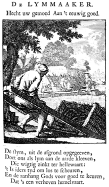 Description: Under a tree, the glue maker lowers a large wicker hamper into the water with the aid of support rails. On the opposite side of the water, other glue makers are at work and there is a large rack for drying animal hides. The Dutch artist and poet Jan Luiken (1649-1712) was responsible for drawing this emblem and for creating the motto and poem that follow. Jan Luiken and/or his son Casper Luiken (1672-1708) were responsible for its etching. The attendant scripture text is Psalm 63:8 though Luiken cites Psalm 63:9.