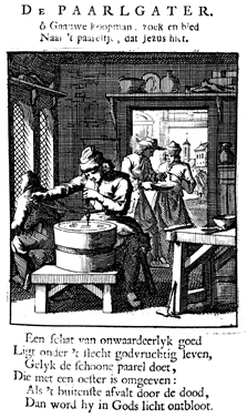 Description: In his workshop, the pearl borer uses a drill-bore to drill holes in pearls. At the entrance to a second room, two men examine pearls in a small bowl. The Dutch artist and poet Jan Luiken (1649-1712) was responsible for drawing this emblem and for creating the motto and poem that follow. Jan Luiken and/or his son Casper Luiken (1672-1708) were responsible for its etching. The attendant scripture text is Matthew 7:6.