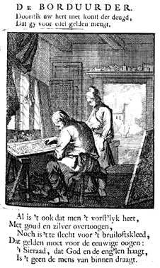 Description: In front of the window, the embroiderer works on a piece of embroidery stretched on a frame; a young man stands next to him and watches. Pieces of embroidery stretched on frames lean against the walls and windows. The Dutch artist and poet Jan Luiken (1649-1712) was responsible for drawing this emblem and for creating the motto and poem that follow. Jan Luiken and/or his son Casper Luiken (1672-1708) were responsible for its etching. The attendant scripture text is Psalm 45:13 though Luiken quotes Psalm 45:14.