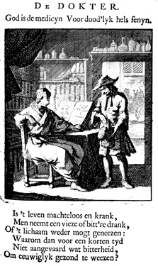 Description: The doctor, wearing a house robe, sits in his study at a table with an opened illustrated botany book. A patient, wearing a hat, stands in front of him and pulls a flask from a wicker basket. Books line the shelves; flasks and jars are on top of the bookcases. The Dutch artist and poet Jan Luiken (1649-1712) was responsible for drawing this emblem and for creating the motto and poem that follow. Jan Luiken and/or his son Casper Luiken (1672-1708) were responsible for its etching. The attendant scripture text is Matthew 8:16-17.