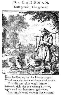 Description: Under a tree, the farmer, surrounded by cattle, chickens and a duck, carries a milk bucket. A farm, two pigs feeding from a trough and a woman cleaning butter churns are in the left background; in the distance, a man plows a field. The Dutch artist and poet Jan Luiken (1649-1712) was responsible for drawing this emblem and for creating the motto and poem that follow. Jan Luiken and/or his son Casper Luiken (1672-1708) were responsible for its etching. The attendant scripture text is Psalm 65:9-13 though Luiken quotes Psalm 65:10-14.