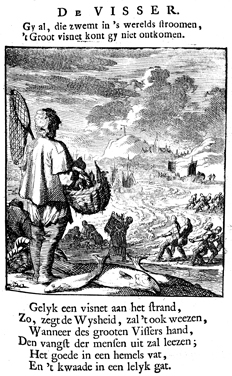 Description: The fisherman, holding a basket and net, stands on a dune near the beach. Fish are in his basket and on the sand next to him. At the beach, several fishermen pull in a net with fish from the sea. In the background is a village in the dunes. The Dutch artist and poet Jan Luiken (1649-1712) was responsible for drawing this emblem and for creating the motto and poem that follow. Jan Luiken and/or his son Casper Luiken (1672-1708) were responsible for its etching. The attendant scripture text is Matthew 4:18-22.