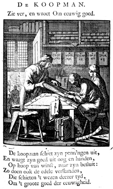Description: Two accountants work at a desk while a third man standing in front of them gives directions. Account books are piled on the floor and line the shelves around the room. On the wall hang notes with names of such countries as England, France, or Spain. Through the open door, large sailboats are visible. The Dutch artist and poet Jan Luiken (1649-1712) was responsible for drawing this emblem and for creating the motto and poem that follow. Jan Luiken and/or his son Casper Luiken (1672-1708) were responsible for its etching. The attendant scripture text is Matthew 6:19-21.