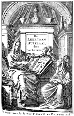 Description: The title-page border introduces this volume of Christian instruction that is based on the furnishings and activities of the home. The Dutch artist and poet, Jan Luiken (1649-1712), whose initials are at the lower right, was responsible for drawing and etching this emblem.