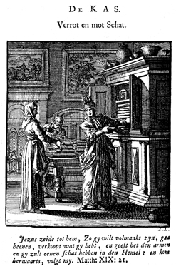 Description: The luxury of this home with its well-stocked linen closet is an indictment of all who ignore the poor and seek their own comfort on earth (Matthew 19:21). The poem urges the reader to get rid of the beautiful linens from the closet of flesh and wood so that the soul may prosper. The Dutch artist and poet Jan Luiken (1649–1712), whose initials are at the lower right, was responsible for drawing and etching this emblem and wrote the accompanying poem.