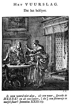 Description: The ordinary, domestic lighter or tinderbox reminds the spiritual person that God’s word is powerful and like a fire (Jeremiah 23:29). The poem urges the reader to acquire God’s light now, while the hand of God still makes the heart beat. The Dutch artist and poet Jan Luiken (1649–1712), whose initials are at the lower right, was responsible for drawing and etching this emblem and wrote the accompanying poem.