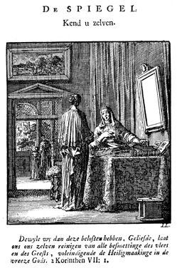 Description: While a woman sits in front of a mirror intent on correcting facial blemishes, the pious are devoted to Scripture and attentive to leading reflective, thoughtful lives (2 Corinthians 7:1). The poem urges the reader to first please the holy eye of God that sees the body as well as the deeds and so find salvation. The Dutch artist and poet Jan Luiken (1649–1712), whose initials are at the lower right, was responsible for drawing and etching this emblem and wrote the accompanying poem.