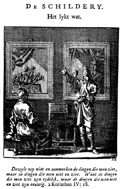Description: Just as the one who teaches his student about painting directs the eyes both to what can be seen and what cannot, so the Christian looks beyond the immediate and temporal to what is unseen and eternal (2 Corinthians 4:18). The poem adds that in the same way the present world with all its riches and dead monuments cannot teach the soul what is most important nor satisfy an eternal hunger. The Dutch artist and poet Jan Luiken (1649–1712), whose initials are at the lower right, was responsible for drawing and etching this emblem and wrote the accompanying poem.