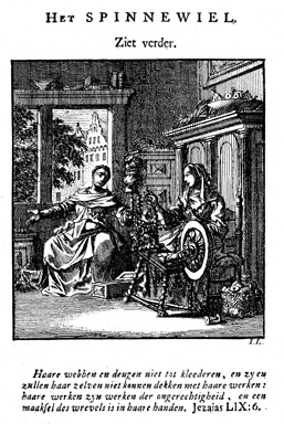 Description: A woman summons her companion at the spinning wheel to loftier horizons. The adjacent poem observes that while much effort and time is given before flax has been changed into a garment, humans would like to obtain the garment for eternal comfort by a merely wishing it so. But like the effort expended on the worldly garment for flesh and blood, so should one prepare the garment of the soul from early on, year in and year out. The life spent on earthly garments will be disappointed at death (Isaiah 59:6), but the one who has prepared his garment for the soul can take it with him and wear it in eternity. The Dutch artist and poet Jan Luiken (1649–1712), whose initials are at the lower right, was responsible for drawing and etching this emblem and wrote the accompanying poem.