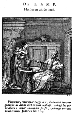 Description: The man who is stingy with lamp oil—saving the oil to dispel future darkness—sits in the darkness. Similarly, many refuse to give themselves over to the light of eternal life in their efforts to preserve their earthly lives (John 12:24; Mark 8:35). The Dutch artist and poet Jan Luiken (1649–1712), whose initials are at the lower right, was responsible for drawing and etching this emblem and wrote the accompanying poem.