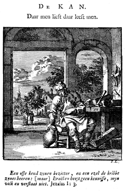 Description: A workman at his bench is careful to set down the jug so that it does not topple over, but people can be so careless in matters of the soul and conscience (Isaiah 1:3). The Dutch artist and poet Jan Luiken (1649–1712), whose initials are at the lower right, was responsible for drawing and etching this emblem and wrote the accompanying poem.