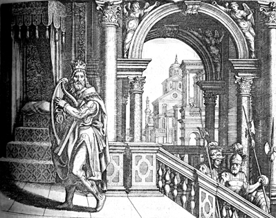Description: David is depicted as the Psalmist with harp in hand. Engraved by Matthaeus Merian (1593-1650).