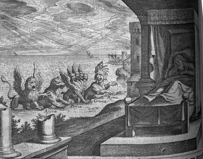 Description: Out of the sea emerge four beasts. Daniel sleeps (right). Engraved by Matthaeus Merian (1593-1650).
