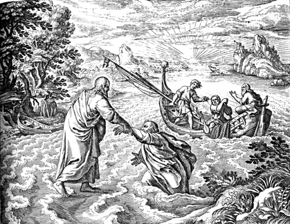 Description: Jesus saves Peter as he begins to sink while walking on water. Engraved by Matthaeus Merian (1593-1650).