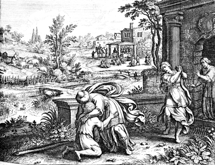 Description: The father embraces his son upon his return home (foreground). The prodigal son tends to the pigs. Engraved by Matthaeus Merian (1593-1650).