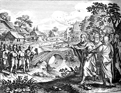 Description: Jesus heals ten lepers but only one returns to give thanks. Engraved by Matthaeus Merian (1593-1650).
