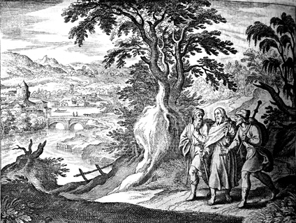 Description: Jesus converses with Cleopas and another disciple on the road to Emmaus. Engraved by Matthaeus Merian (1593-1650).