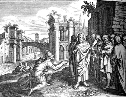Description: Jesus tells the official that his son has been made well (foreground), while the official is greeted by his slaves who confirm this news (background). Engraved by Matthaeus Merian (1593-1650).