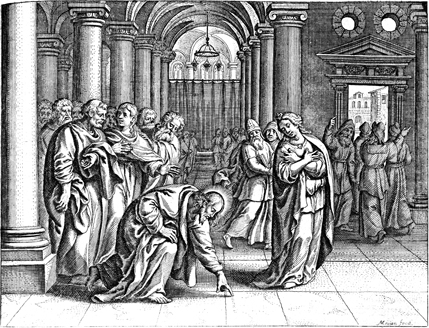 Description: Jesus writes on the ground with his finger during the trial of the adulterous woman. Engraved by Matthaeus Merian (1593-1650).