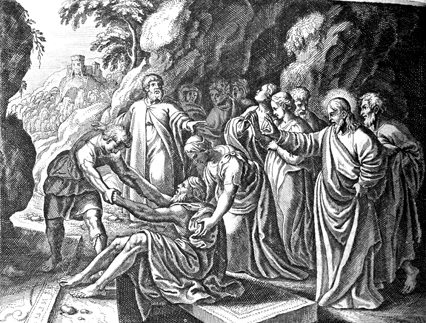 Description: As a crowd watches in amazement, Jesus raises Lazarus, now dead four days. Engraved by Matthaeus Merian (1593-1650).