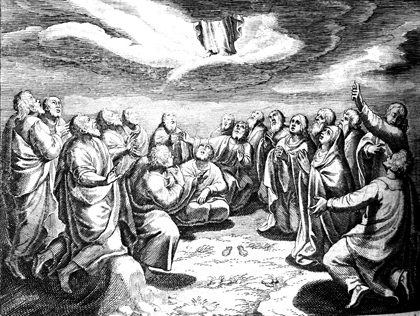 Description: Jesus ascends to heaven in a cloud, while the disciples look on. Engraved by Matthaeus Merian (1593-1650).