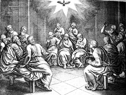 Description: The Holy Spirit descends upon the believers in the form of a dove on Pentecost. Engraved by Matthaeus Merian (1593-1650).