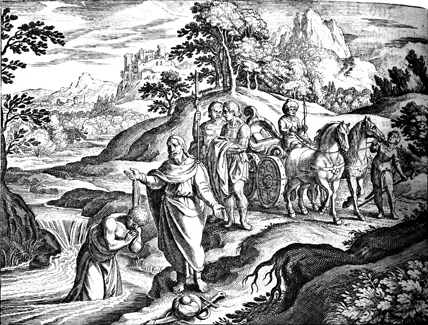 Description: The Ethiopian eunuch is baptized by Philip along the road. Engraved by Matthaeus Merian (1593-1650).