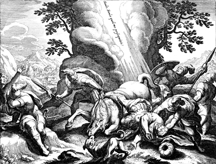 Description: Saul falls from his horse as the risen Christ asks why Saul is persecuting Him. Engraved by Matthaeus Merian (1593-1650).
