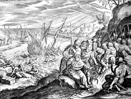 Description: Paul is bitten by a viper on the island of Malta after his boat is shipwrecked. Engraved by Matthaeus Merian (1593-1650).