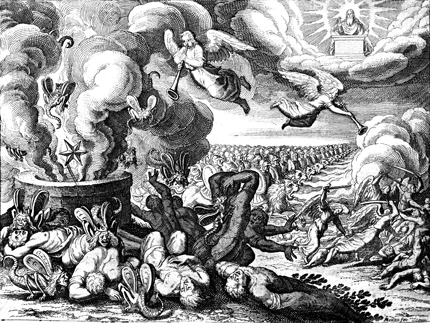 Description: An angel sounds the fifth trumpet, causing a star to fall from heaven and open the Abyss, allowing locust-like creatures to prey upon the earth (right). An angel sounds the sixth trumpet and causes the attack of an army of angels and lion-like horses Engraved by Matthaeus Merian (1593-1650).