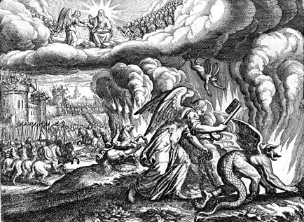 Description: An angel, holding a key, binds the beast in the abyss for the thousand years of peace, as the saints worship God (background). Engraved by Matthaeus Merian (1593-1650).