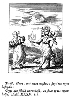 Description: The Soul, portrayed as a young woman in a long dress, is terrified when she meets a three-headed monster, carrying a sickle in his left hand and fire in his right hand, in the desert. The Monster is the personification of Death, Hell, Flesh, the Devil, and Sin.