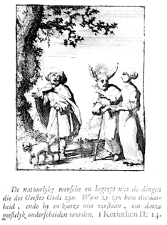 Description: The Soul and the Flesh encounter a blind man walking his dog. The Dutch artist and poet, Jan Luiken (1649-1712) was responsible for drawing and etching this emblem and composing the poem that accompanies it.