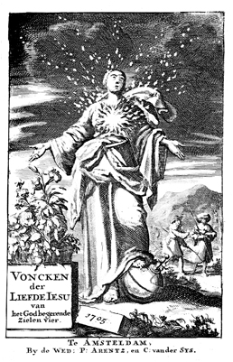 Description: This frontispiece image depicts a woman with a blazing sun on her chest. Beneath her left foot is a globus cruciger, and behind her are dark clouds.
