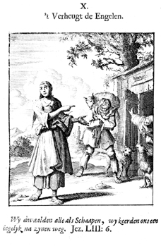 Description: A woman points towards a man carrying a lamb on his shoulders.