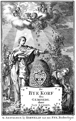 Description: This title page features a beehive standing on a stone with the engraving “De ByeKorf des Gemoeds door Jan Luiken”. Two women next to the beehive observe the activities of the bees. The woman to the right is kneeling; behind her is a vase with flowers. The woman to the left is standing under the sun and is irradiated by an heavenly light, coming from a cloud with five cherubs and an angel that scatters flowers on the beehive below. Behind the standing woman, a child carries a vase with flowers. The page was etched and engraved by the Dutch artist and poet Jan Luiken (1649-1712), introducing the first edition of his religious emblem book. His initials are at the lower right.