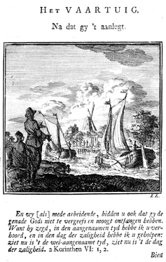 Description: A man on the left foreground points to two vessels on the river with sails set in different directions. As a result the same wind propels the vessels in two different directions. On the opposite side of the river two men stand in front of a narrow gate and a windmill is located farther up the hill. The Dutch artist and poet Jan Luiken (1649-1712), whose initials are at the lower right, was responsible for drawing and etching this emblem, as well as for the poem that accompanies it (below).