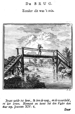 Description: A traveler carrying a basket on a pole walks across a river on a wooden bridge with many steep steps leading up to the bridge on each end.. Looking underneath the bridge a church can be seen in the distance and a pair of swans closer by. The Dutch artist and poet Jan Luiken (1649-1712), whose initials are at the lower right, was responsible for drawing and etching this emblem, as well as for the poem that accompanies it (below).