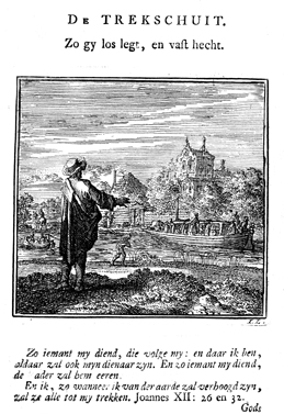 Description: A man on the foreground point to two tow barges filled with passengers on the river. A small one in towed by a man and a large one on the opposite side of the river is towed by horse with a rider. The Dutch artist and poet Jan Luiken (1649-1712), whose initials are at the lower right, was responsible for drawing and etching this emblem, as well as for the poem that accompanies it (below).