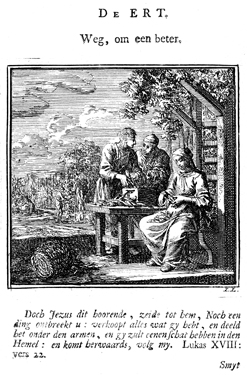 Description: A woman and two men are shelling peas in a gazebo; a box on the table and a fallen over basked on the ground are full of unshelled peas. In the garden more peas are being picked. The Dutch artist and poet Jan Luiken (1649-1712), whose initials are at the lower right, was responsible for drawing and etching this emblem, as well as for the poem that accompanies it (below).