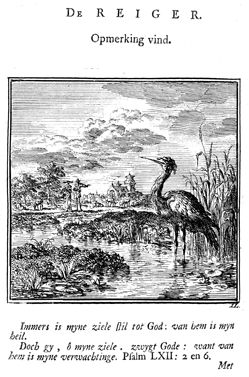 Description: A heron stands in the water next to a group rushes waiting for a catch. A couple on the shore watches him; in the distance a church. The Dutch artist and poet Jan Luiken (1649-1712), whose initials are at the lower right, was responsible for drawing and etching this emblem, as well as for the poem that accompanies it (below).