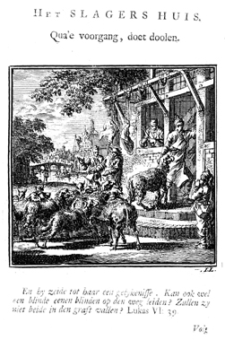 Description: A sheep is forcefully pulled into a butcher’s shop, whereupon the rest of the flock follows, although one sheep looks like he is about to stray from the flock. Several pieces of meat hang on hooks on the outside of the shop. A cityscape can be seen in the background. The Dutch artist and poet Jan Luiken (1649-1712), whose initials are at the lower right, was responsible for drawing and etching this emblem, as well as for the poem that accompanies it (below).
