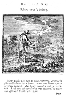 Description: A man talks to a large hissing snake that slithers to the side of him. In the background is a landscape with a wide river bordered by mountains. The Dutch artist and poet Jan Luiken (1649-1712), whose initials are at the lower right, was responsible for drawing and etching this emblem, as well as for the poem that accompanies it (below).