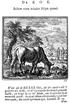 Description: A cow grazes in a meadow while a bird sits in front of her. Two women and more cows are in the distant meadow across a pond; a church can be seen in the far distance. The Dutch artist and poet Jan Luiken (1649-1712), whose initials are at the lower right, was responsible for drawing and etching this emblem, as well as for the poem that accompanies it (below).