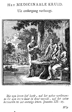 Description: A man sits at an outside table while two servants show him a number of plants. In the background is a large garden with several people looking at plants. The Dutch artist and poet Jan Luiken (1649-1712), whose initials are at the lower right, was responsible for drawing and etching this emblem, as well as for the poem that accompanies it (below).